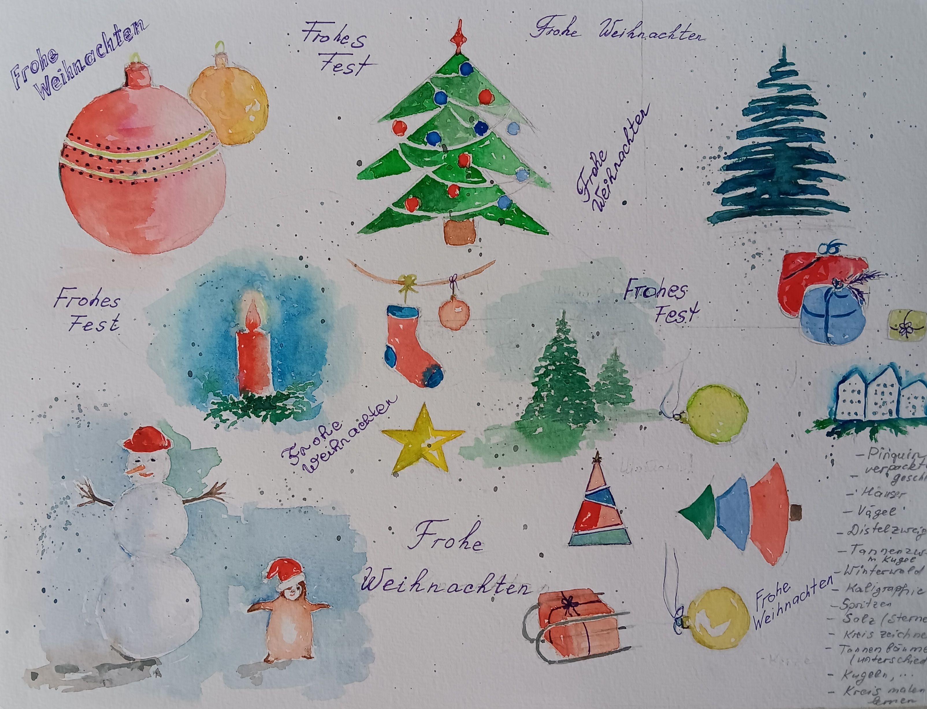 In diesem Kurs gestalten Sie individuelle, weihnachtliche Motive mit Aquarellfarben – stimmungsvoll, kreativ und ganz nach Ihrem Geschmack. Dabei lernen Sie die Grundtechniken der Aquarellmalerei kennen und setzen diese gleich in kleinen Kunstwerken um. Neugierig geworden? Dann schauen Sie auch unter  www.kunst-im-hasetal.de/marina-luepken.