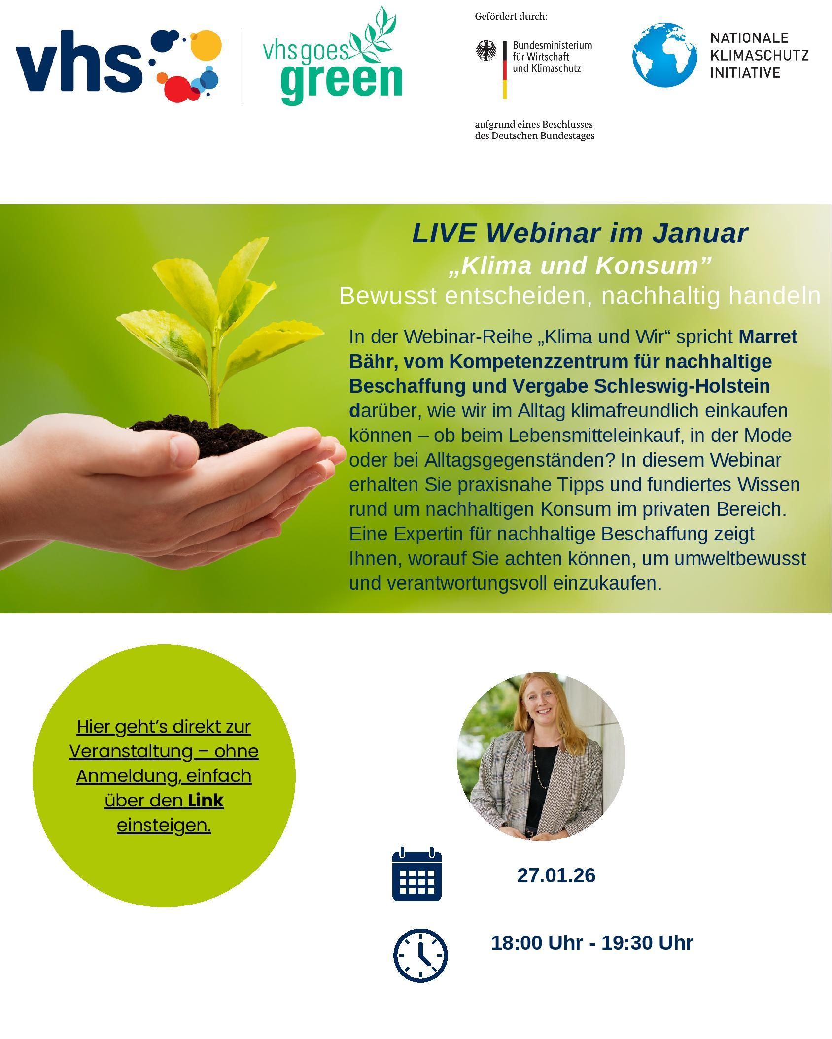darüber, wie wir im Alltag klimafreundlich einkaufen können – ob beim Lebensmitteleinkauf, in der Mode oder bei Alltagsgegenständen? In diesem Webinar erhalten Sie praxisnahe Tipps und fundiertes Wissen rund um nachhaltigen Konsum im privaten Bereich.